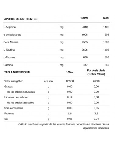 INGREDIENTES: Agua, L-Arginina alfa-cetoglutarato, beta-alanina, taurina, acidulante (ácido cítrico), l-tirosina, cafeína, aroma, conservadores (sorbato potásico, benzoato sódico), espesante (goma xantana), edulcorantes (sucralosa, glucósidos de esteviol procedentes de estevia), colorante (caramelo natural). Contiene cafeína. No recomendado para niños ni mujeres embarazadas o en periodo de lactancia (250mg/60ml).
