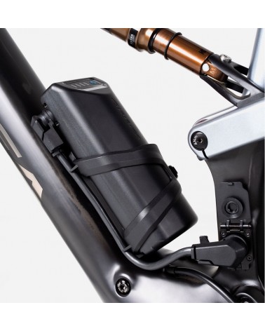 La batterie externe peut être fixée en toute sécurité dans l'espace prévu pour le porte-bidon. Le câble reliant la batterie externe au point de recharge standard se replie rapidement et en toute sécurité et ne gêne pas les pédales.